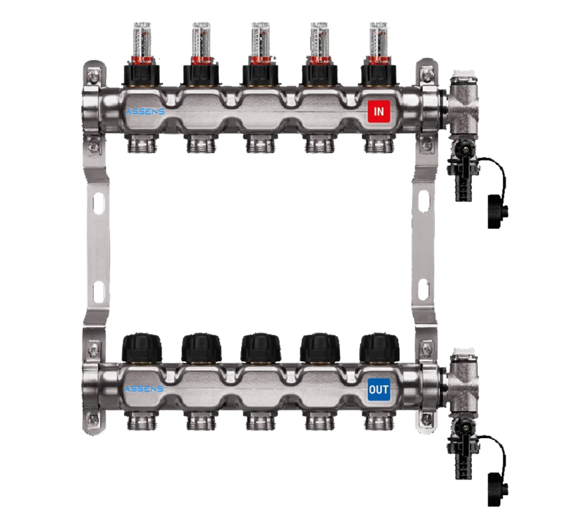 Collettore in acciaio inox 1"-3/4" EK con valvola termostatica M30x1,5 e valvola flussometrica